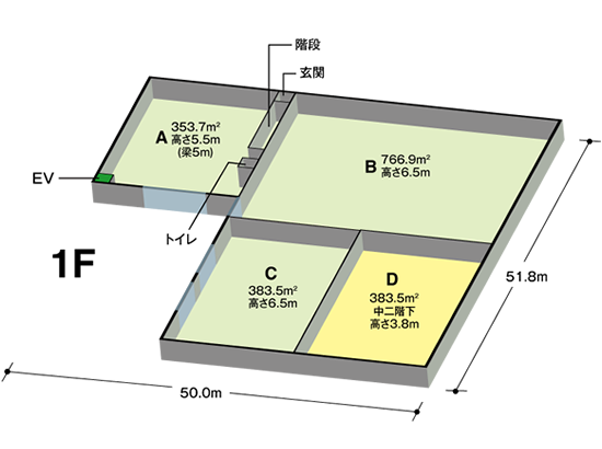 坪数 天井高 A 107坪 5.5m B 232坪 6.5m C 116坪 6.5m D 116坪 3.8m